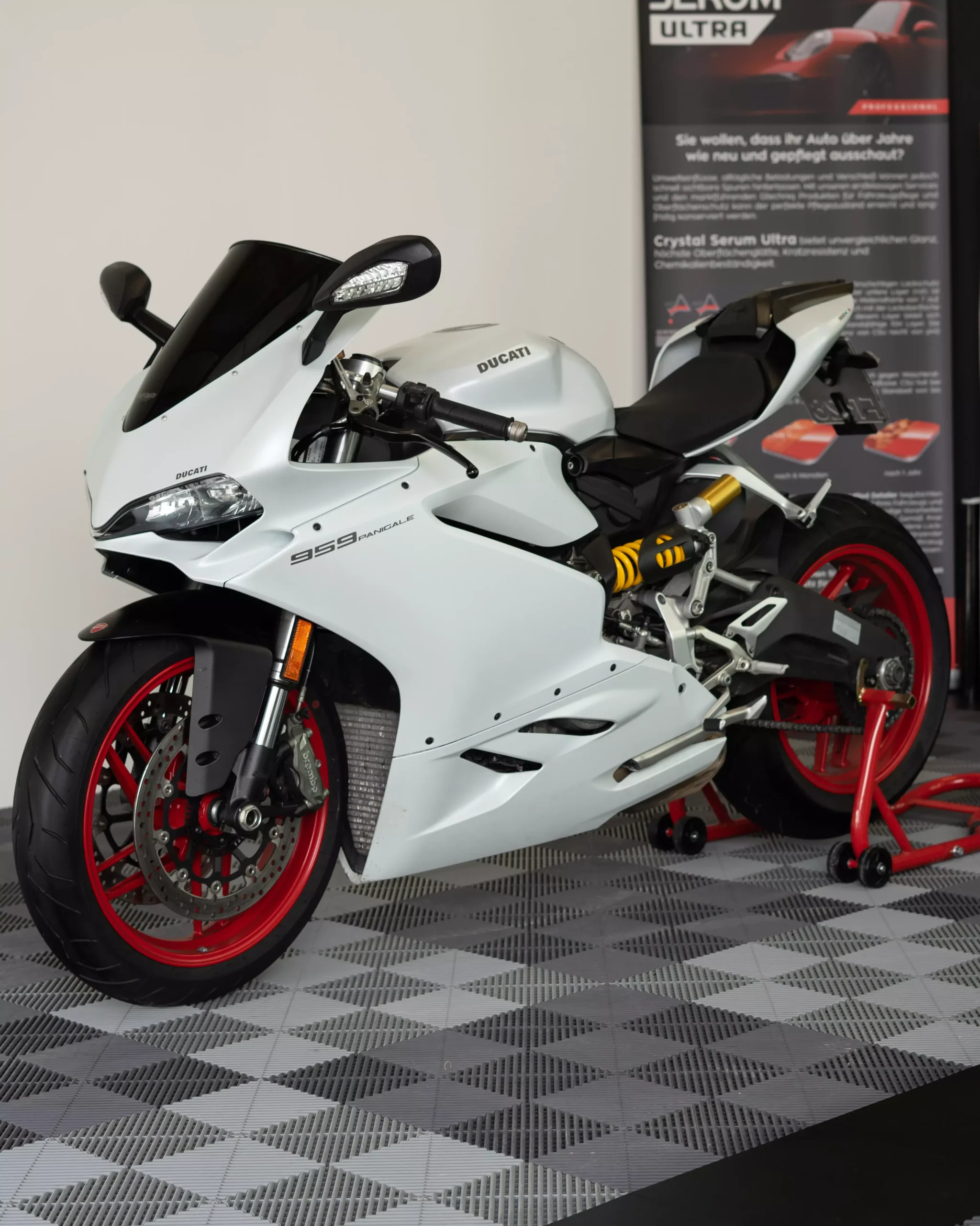 Stellen Sie sich manchmal die Frage was Sie eigentlich nicht können? Wir, bei der GLAXI GmbH, stellen uns diese Frage und sind stets offen für neue Erlebnisse und Herausforderungen. Mit diesem Auftrag ging es uns genauso. Das erste Mal, dass wir ein Motorrad folieren durften und als ob das noch nicht genug ist, handelte es sich sogar um eine Designfolierung. Eine gelungene Premiere, könnte man sagen. Genauso gelungen ist unserer Meinung nach das Design von dieser Ducati Panigale. Gemeinsam mit dem Besitzer dieser Ducati, überlegten wir sehr sorgsam, wie wir ein Design erstellen können, welches sowohl zur Marke Ducati passt als auch ansprechend bleibt. Letzteres war dem Besitzer sehr wichtig, da er wie die meisten von uns relativ schnell gelangweilt ist, wenn er eine bestimmte Farbe bzw. ein bestimmtes Design alltäglich auf einem Fahrzeug zu sehen bekommt. Höchstwahrscheinlich kennen Sie dieses Gefühl selbst, vor allem wenn Sie bei der Farbwahl ihres Fahrzeugs etwas speziellere Farben gewählt haben, dass man nach gewisser Zeit gelangweilt ist und nach etwas abwechslungsreicherem sucht. Gerade deshalb war dieses Design bereits beim Entwurf eine Herausforderung, da wir das Ziel hatten, dass das Design der Ducati Panigale ansprechend bleibt und man es selbst nach einer langen Zeit immer noch interessant findet. Schlussendlich einigten wir uns gemeinsam auf das oben zu sehende Design, welches sowohl die Marke Ducati und ihre italienische Herkunft wiederspiegelt als auch ansprechend bleibt, egal wie oft man diese Ducati Panigale sieht. Das Anbringen der Folie war zwar ebenfalls eine Herausforderung, jedoch meisterten sie unsere erfahrenen Mitarbeiter exzellent. Besonders gefreut hat uns natürlich die extrem positive Reaktion des Besitzers als er seine Ducati Panigale wieder abholte. Wenn nun auch Ihr Interesse an einer Ducati Panigale Designfolierung geweckt wurde, dann zögern Sie nicht uns zu kontaktieren. Selbstverständlich stellt das Folieren von sowohl Motorrädern als auch Sportwagen kein Problem für uns da, seien es Porsche, Lamborghini, Ducati und co. Außerdem bieten wir nicht nur die Designfolierung von z.B. solch einer Ducati Panigale an sondern ebenfalls Teil-, Voll- oder Lackschutzfolierungen.