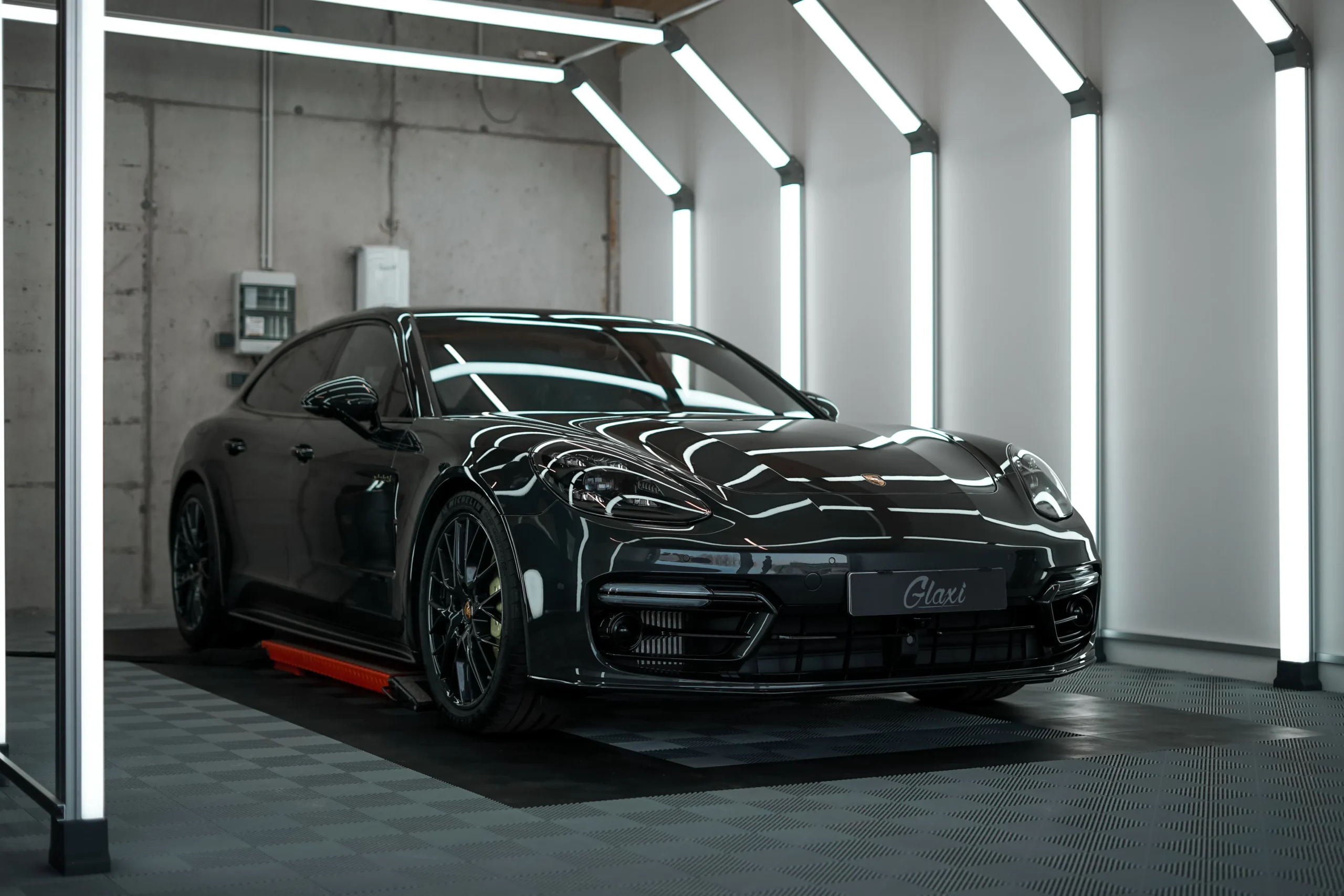 • Ein noch beklebter, neuer Porsche Panamera Turbo S der zur Lackpflege kommt.