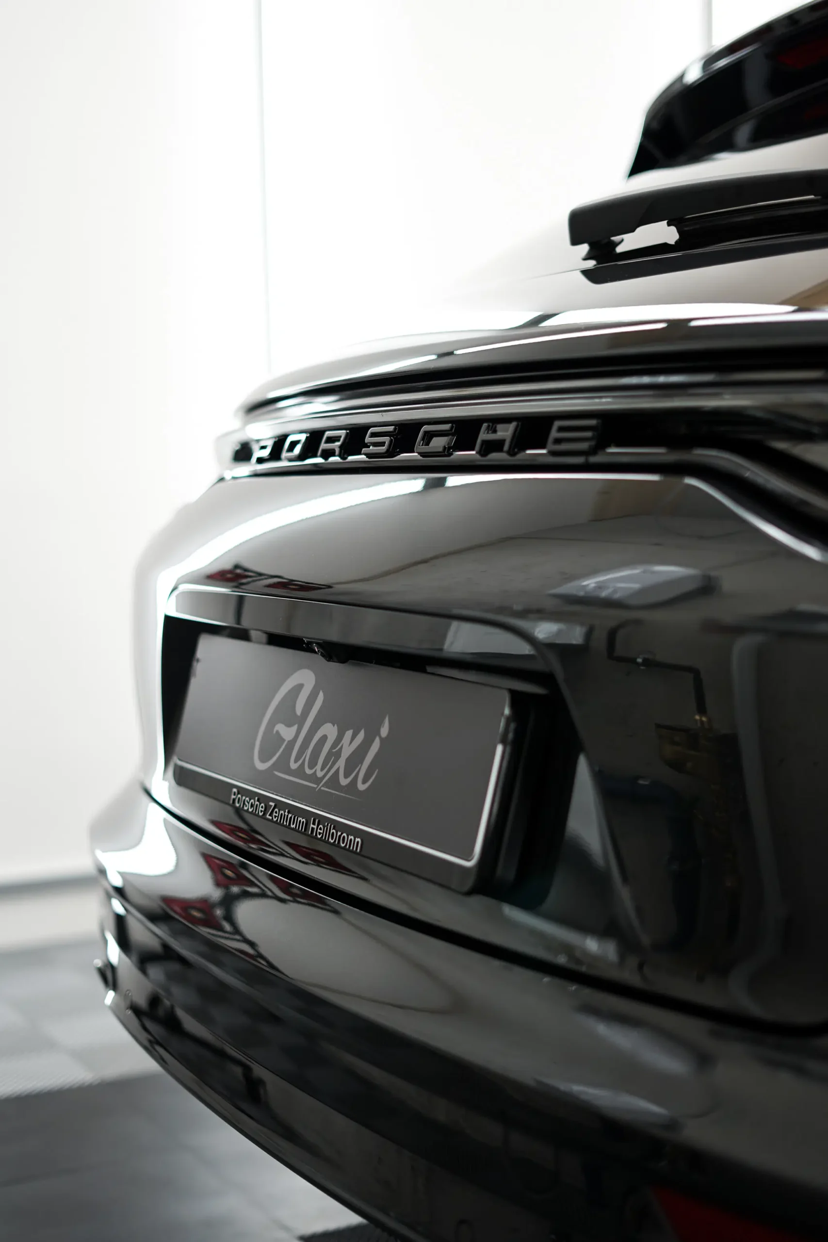 • Porsche Logo auf grauer Motorhaube glänzt nach Lackpflege