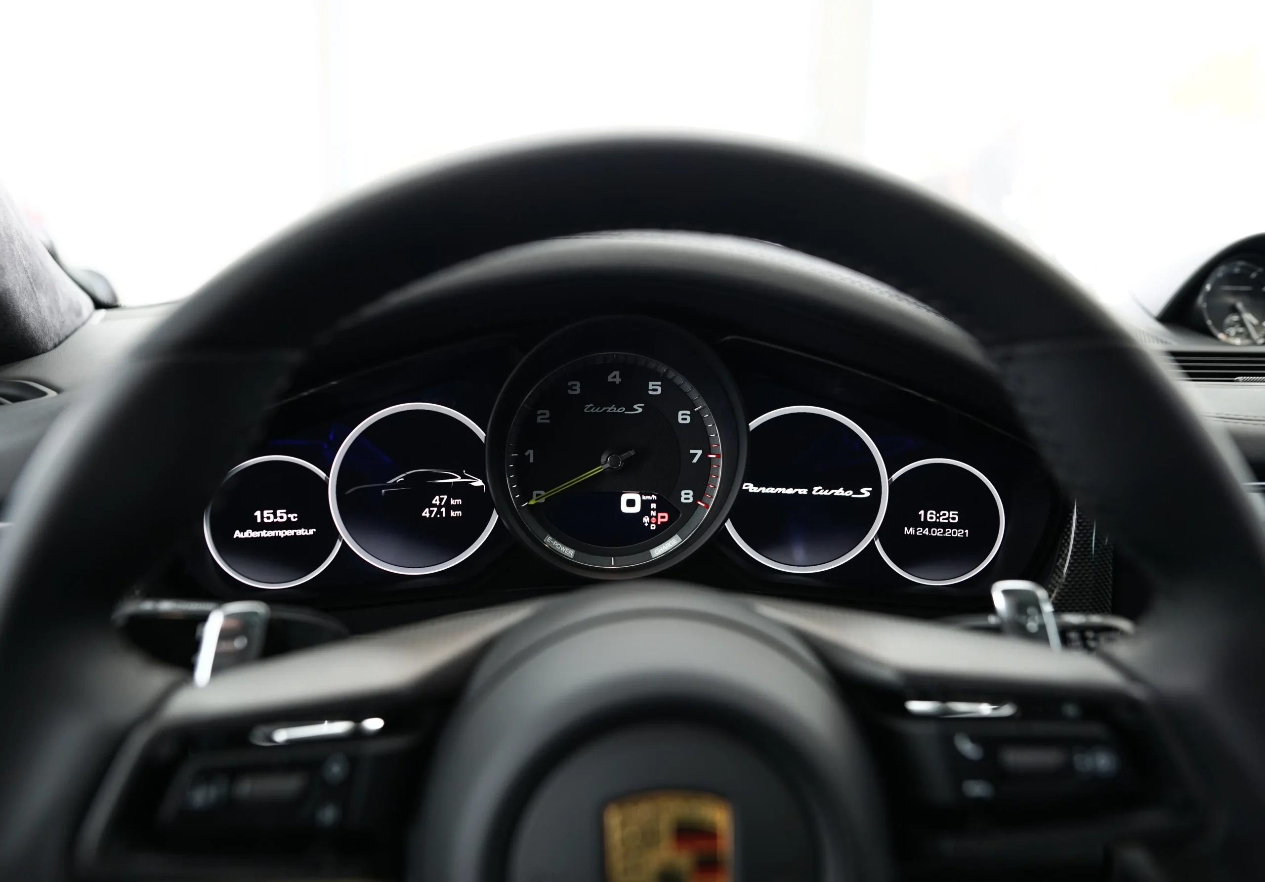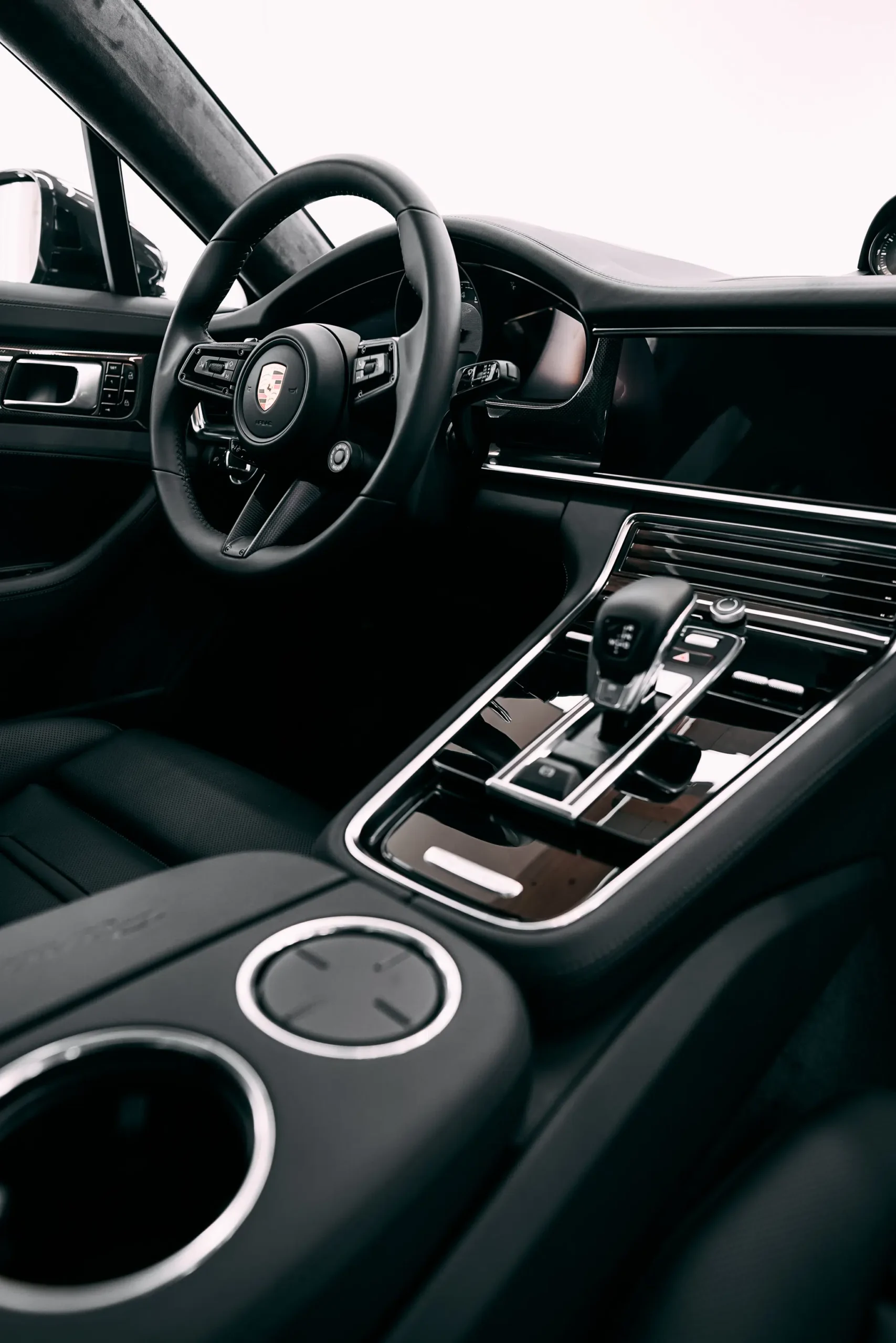 • Innenraum mit viel Leder in schwarz mit schwarzer Ziernaht eines Porsche Panamera Turbo S. Sauber nach einer Innenraumaufbereitung.